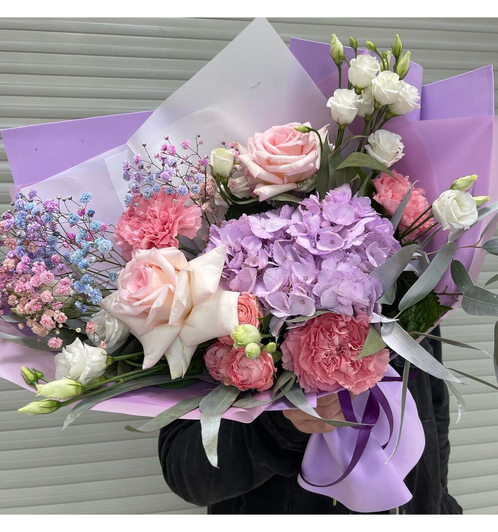 Композиция "Лавандовый сон" — волшебный букет, наполненный нежностью и мечтательностью. В его состав входят ароматные гортензии, прекрасные розы и кустовые розы, которые создают романтическую атмосферу. Завершают образ букета белые эустомы, эвкалипт Baby Blue и гипсофила радужная. Упаковка дизайнерского исполнения дополняет образ, придаёт букету элегантность и уникальность. Этот букет станет прекрасным подарком для особых моментов и событий, чтобы подчеркнуть нежность чувств и передать пожелания тепла и счастья.
